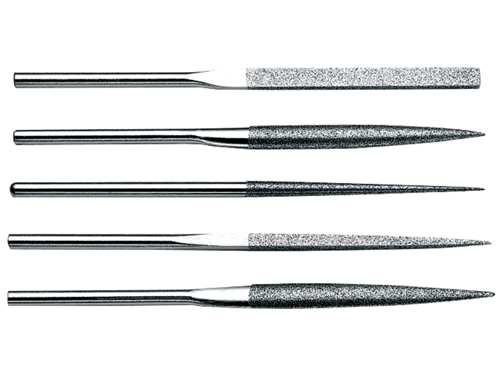 Set de 5 limas de diamante forma rectangular, media caña, circular, cuadrada y almendra, #400, largo 90, long diam. 45mm