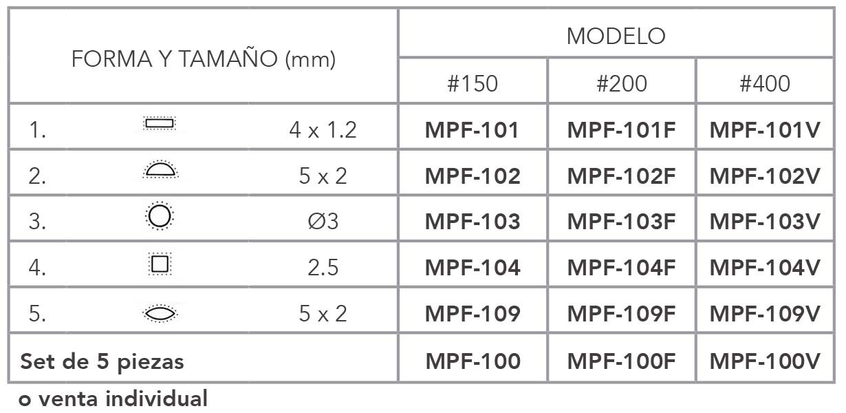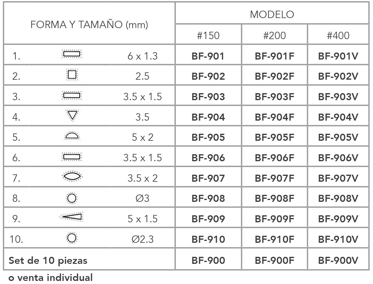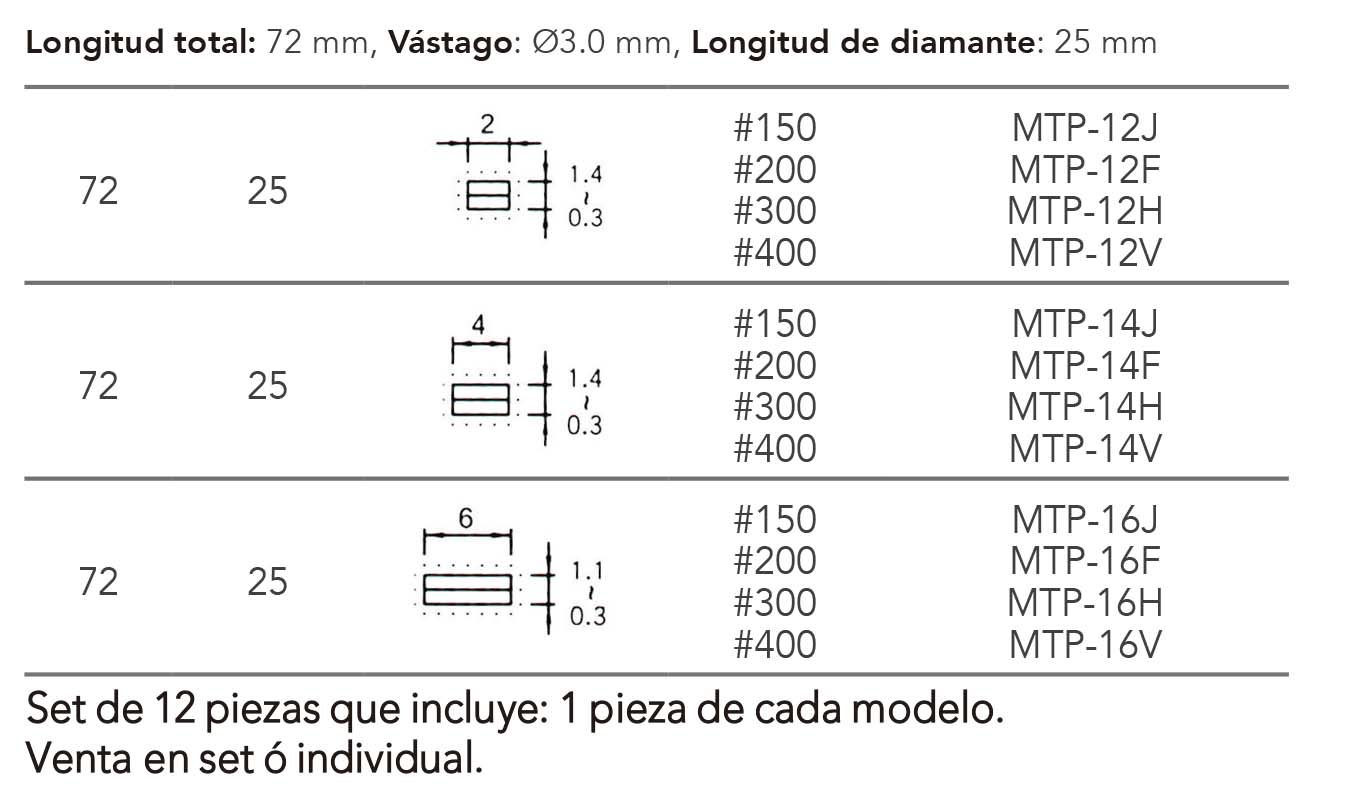 Lima de diamante MBF-900 SET - Longitud total: 65 mm, vástago: Ø 3.0 mm, longitud de diamante: 20 ~ 30 mm.